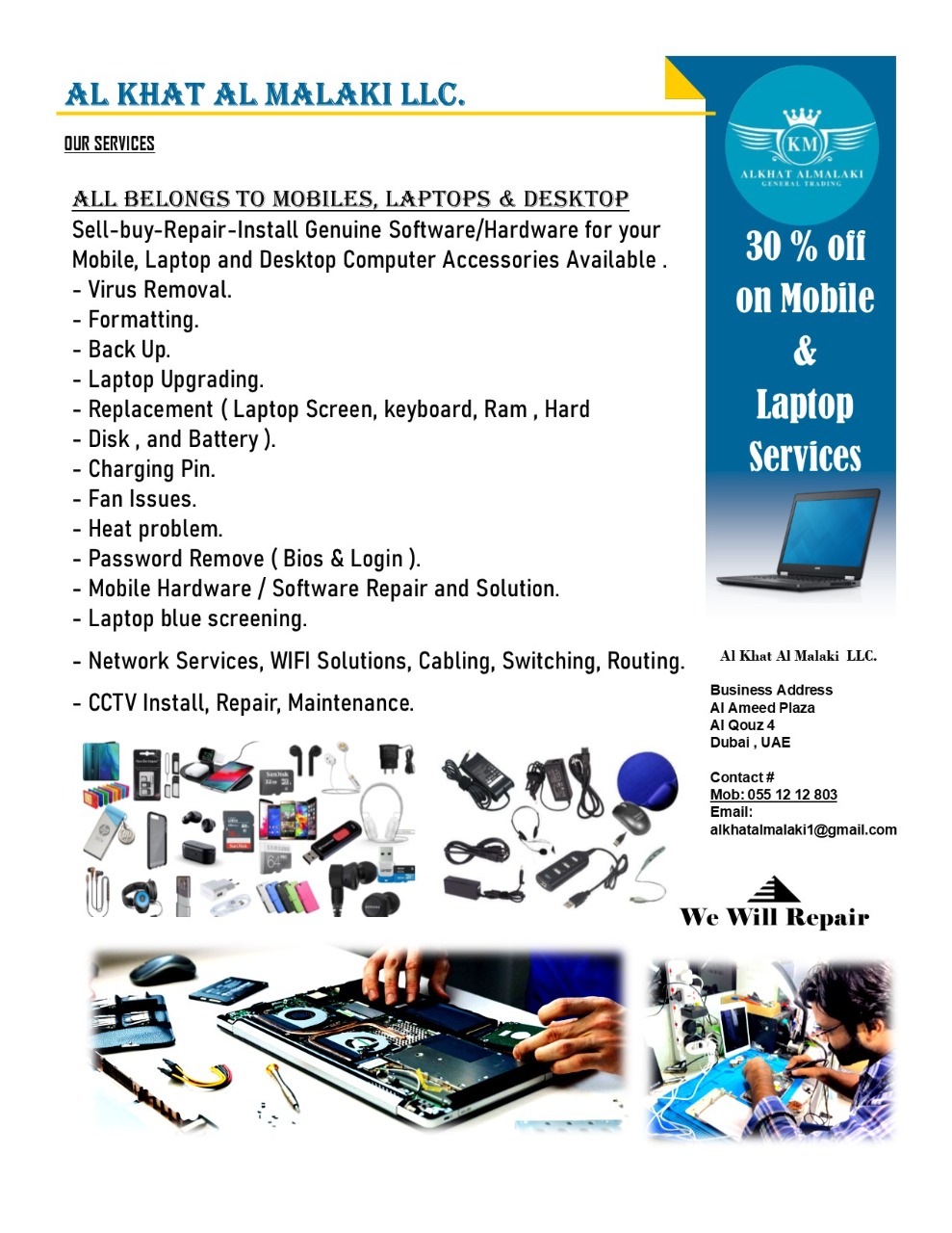 Hi, We Repair Laptop / Mobile Software/Hardware Virus Removal, Formatting, Software problems, Laptop blue screening, Mobile Water Damage , Screen Broken , CCTV, Networking
